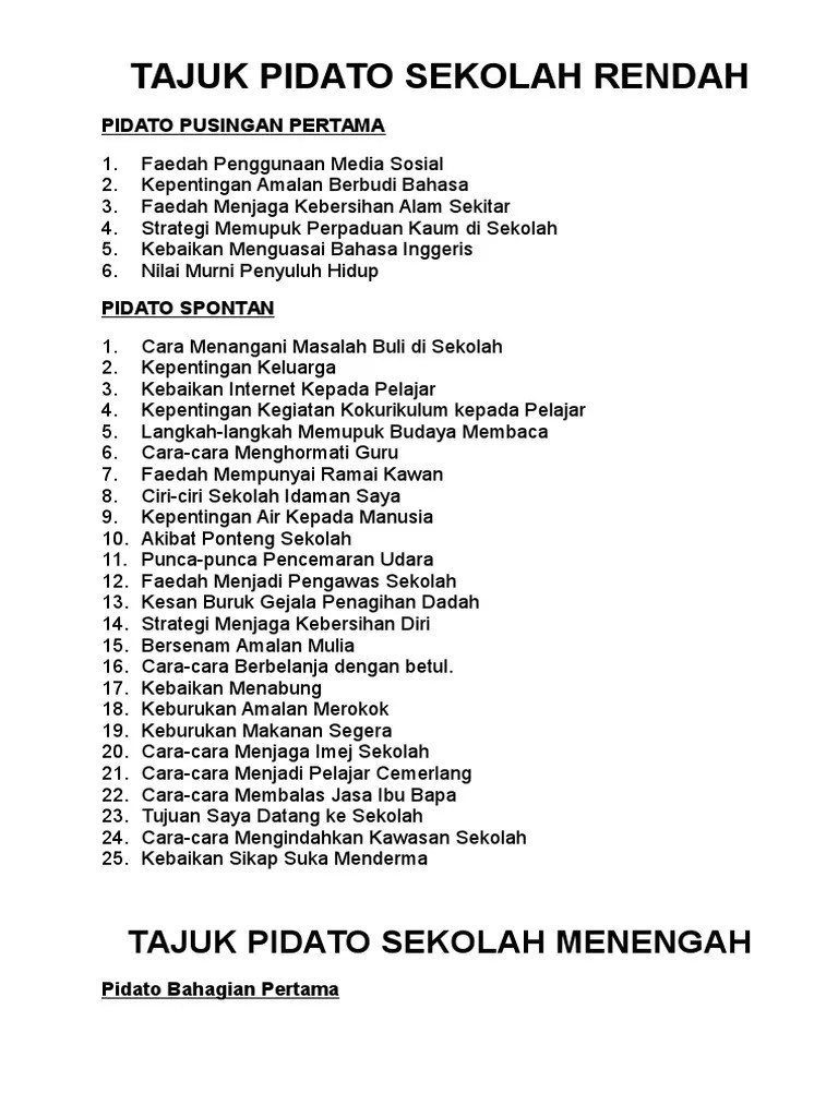 Saya.,dari sk hutchings,pulau pinang, ingin menyampaikan sebuah pidato yang bertajuk kepentingan kegiatan kokurikulum. Assalamu'alaikum warrahmatullahi wabarakatuh, bapak kepala sekolah yang saya hormati. Pucuk manis permatang budi, pucuk purut di getus rusa, yang manis bernama budi, yang indah bernama bahasa. Dokumen tips contoh pidato sekolah renda. Bahasa lambang perpaduan rakyat assalamualaikum, salam sejahtera, salm pidato piala diraja.